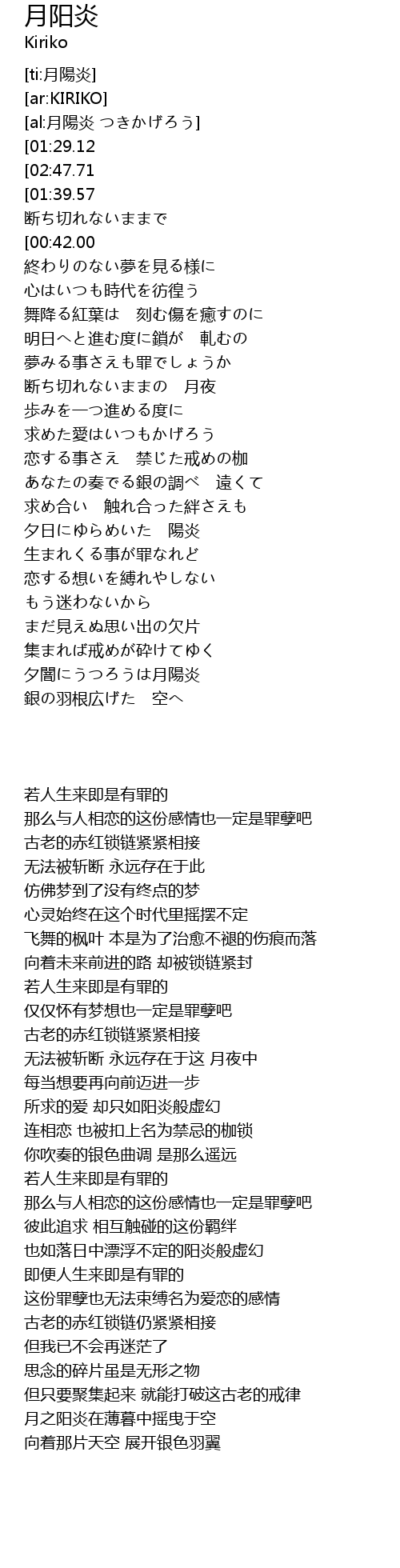 | [00:10.97][01:39.57][04:08.31] | 繋がれた 古の赤い鎖 |