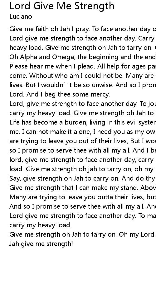 | Lord, give me strength to face another day. To journey along life' s road, to carry my heavy load. Give me strength oh Jah to tarry on. Oh my Lord. | |