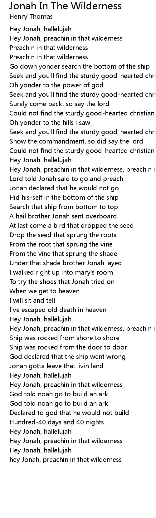Hey Jonah, preachin in that wilderness, preachin in that wilderness |