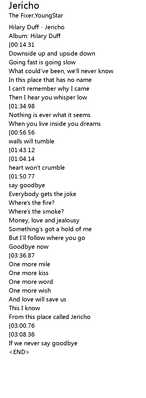| [00:43.86][01:34.98] | One more mile to Jericho |