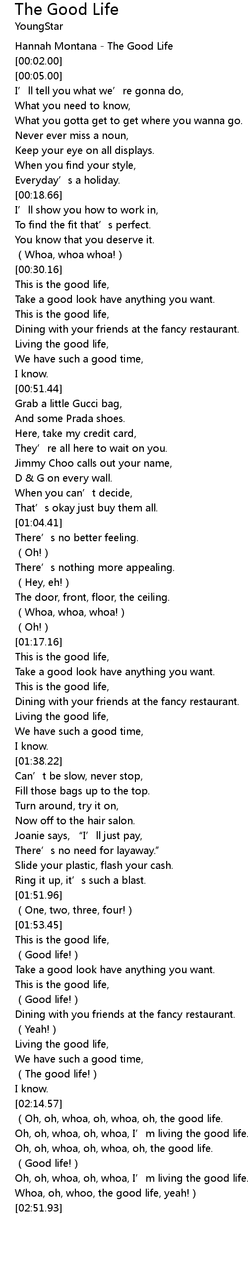 | [02:14.89] | Oh, oh, whoa, oh, whoa, oh, the good life. |