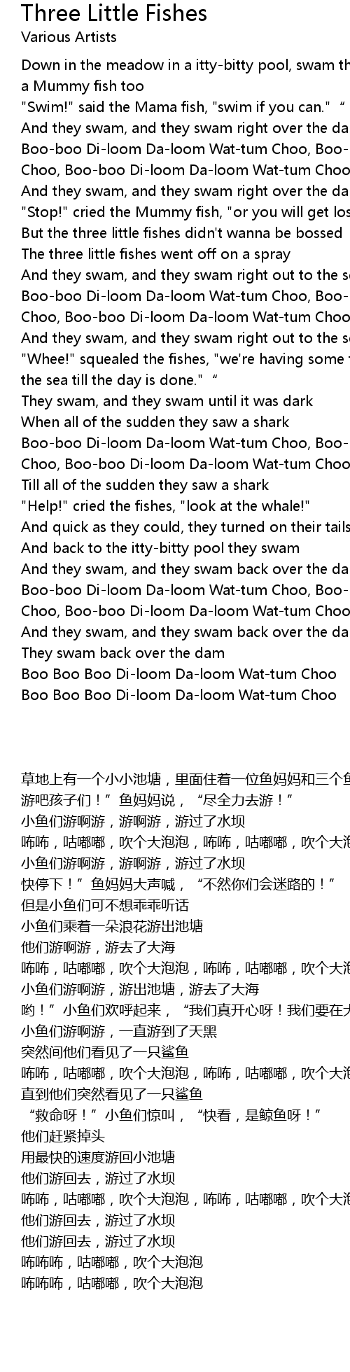 | [00:01.000] | Down in the meadow in a itty-bitty pool, swam three little fishes and a Mummy fish too |