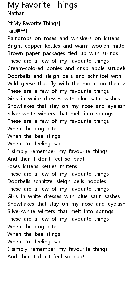 | [00:04.45] | Raindrops on roses and whiskers on kittens |