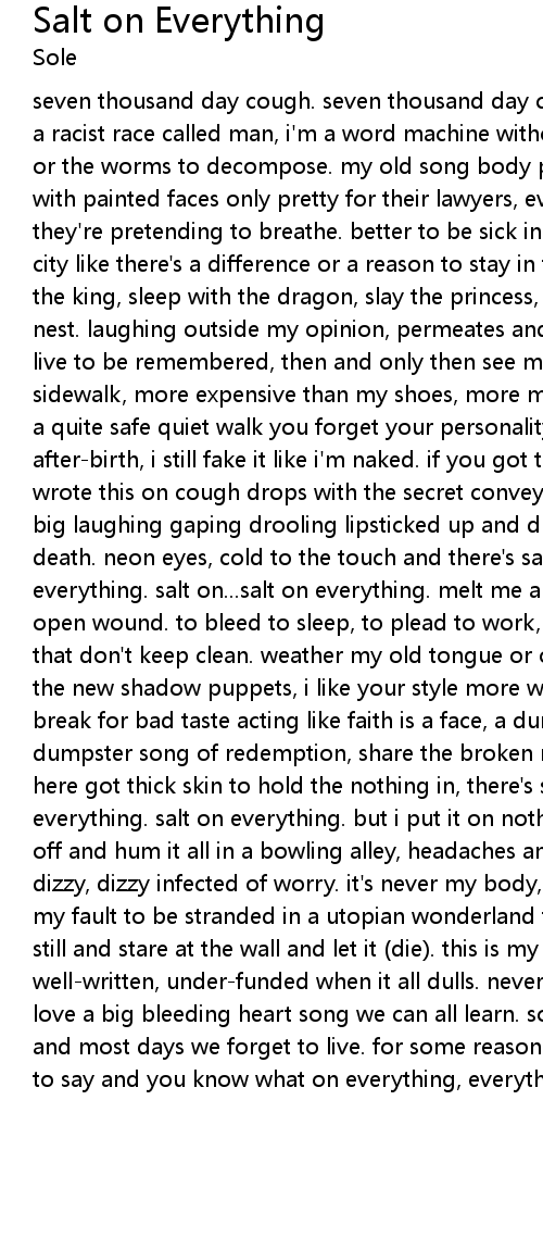 seven thousand day cough. seven thousand day cough. my lungs of an old woman of a racist race called man, i'm a word machine without enough words to be composed or the worms to decompose. my old song body pretty for the showing. party women with painted faces only pretty for their lawyers, everything's illegal 'cause they're pretending to breathe. better to be sick in the head then sane in the city like there's a difference or a reason to stay in the city. sell the mob to the king, sleep with the dragon, slay the princess, lay peaceful in the nothing nest. laughing outside my opinion, permeates and lives forever. the way people live to be remembered, then and only then see me perfect, more perfect than the sidewalk, more expensive than my shoes, more meaningful then hidden messages. in a quite safe quiet walk you forget your personality when they birth in the after-birth, i still fake it like i'm naked. if you got the right sunglasses, i wrote this on cough drops with the secret conveyer belt in the sidewalk and the big laughing gaping drooling lipsticked up and dressed like the lighter side of death. neon eyes, cold to the touch and there's salt on (pssst). salt on everything. salt on...salt on everything. melt me a princess thought like an open wound. to bleed to sleep, to plead to work, to heal no loyalty to things that don't keep clean. weather my old tongue or old tone to the man making all the new shadow puppets, i like your style more worthwhile then rubbish. a big break for bad taste acting like faith is a face, a dumpster man singing a dumpster song of redemption, share the broken note, it's the only note. people here got thick skin to hold the nothing in, there's salt on everything. salt on everything. salt on everything. but i put it on nothing. lick your merry lips off and hum it all in a bowling alley, headaches and hogwash going on in my ears dizzy, dizzy infected of worry. it's never my body, my friends, or my brain, or my fault to be stranded in a utopian wonderland for three minutes i could sit still and stare at the wall and let it (die). this is my favorite mini-series, well-written, under-funded when it all dulls. never decaffeinated dream and i love a big bleeding heart song we can all learn. some days we almost feel alive and most days we forget to live. for some reason, that's all i can bring myself to say and you know what on everything, everything. |