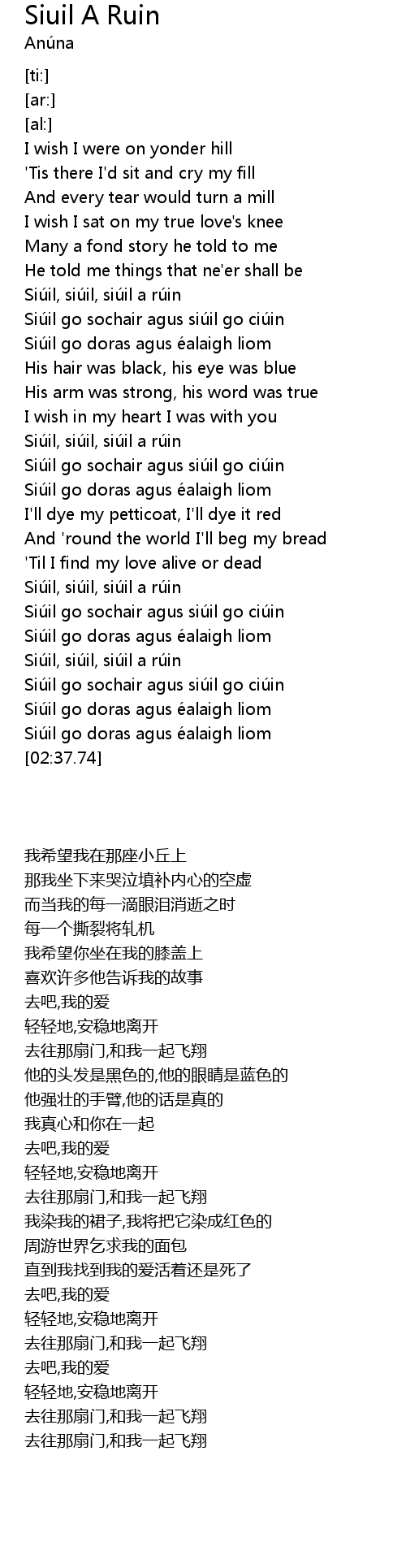 | [01:13.17] | Siú il, siú il, siú il a rú in |