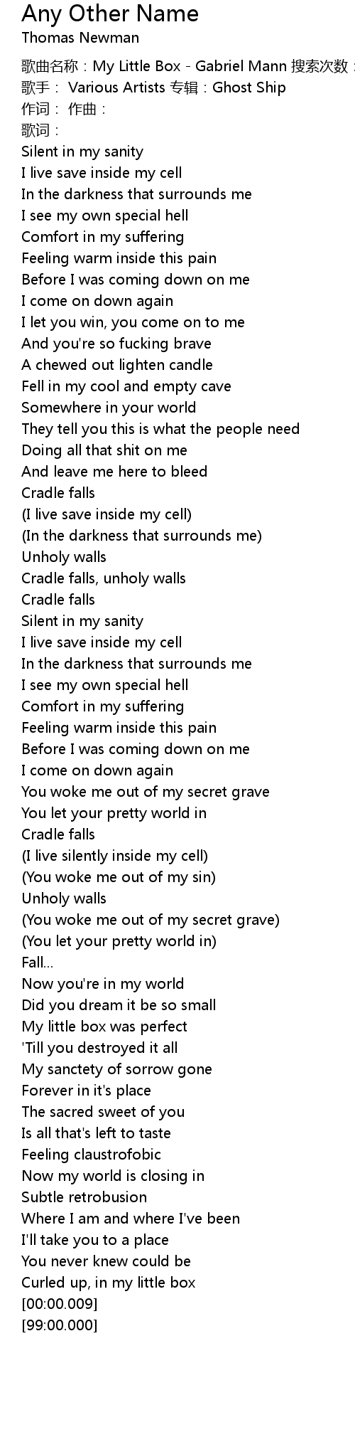 | [00:01.08] | gē qǔ míng chēng: My Little Box Gabriel Mann sōu suǒ cì shù: 429 |