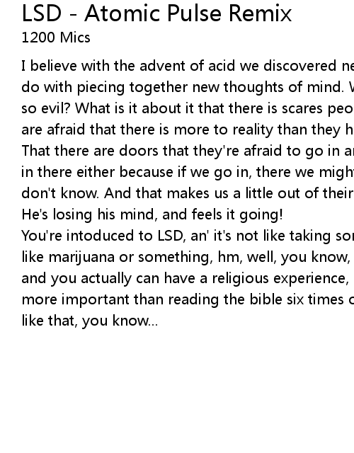 | You're intoduced to LSD, an' it's not like taking some other drug for instance like marijuana or something, hm, well, you know, it's altogether a new thing, and you actually can have a religious experience, and, hm, and it can be even more important than reading the bible six times or becoming a pope or something like that, you know... |