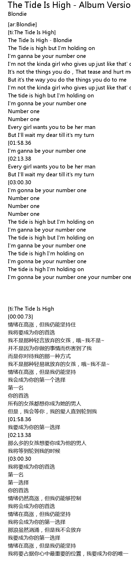 | [00:36.52] | The Tide is high but I'm holding on |