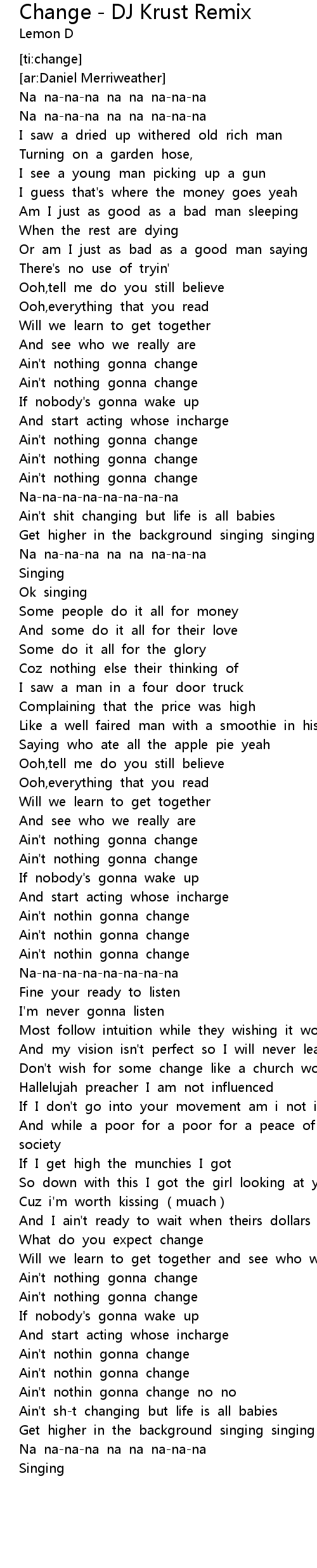 | [00:55.36] | Ain' t nothing gonna change |