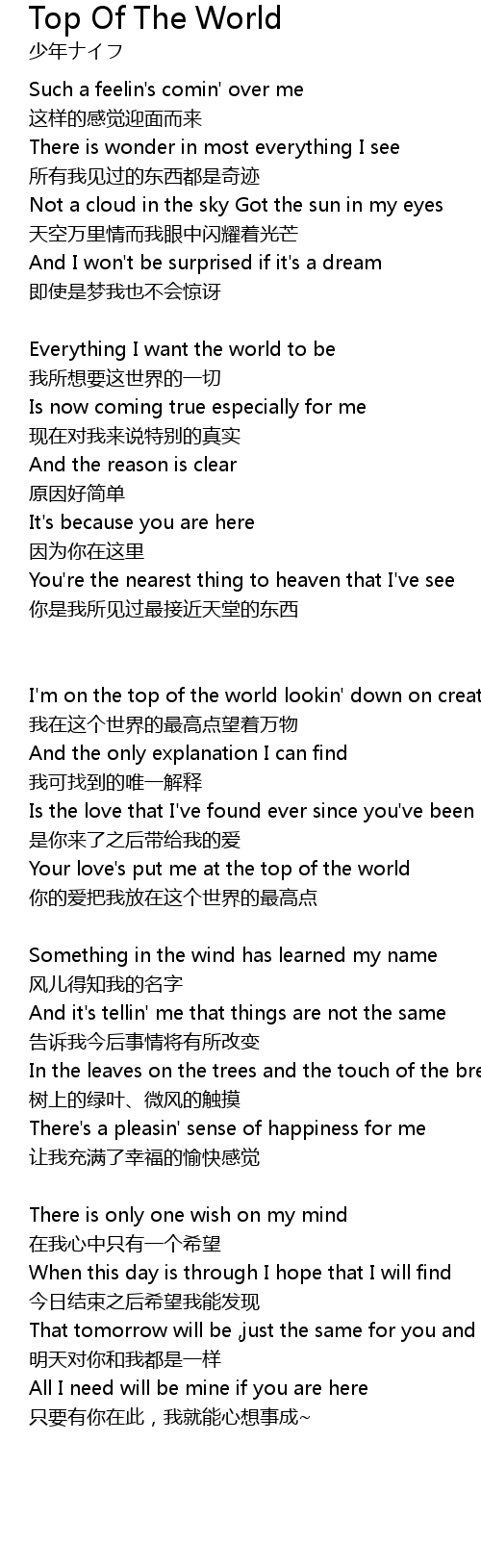 | I' m on the top of the world lookin' down on creation | |