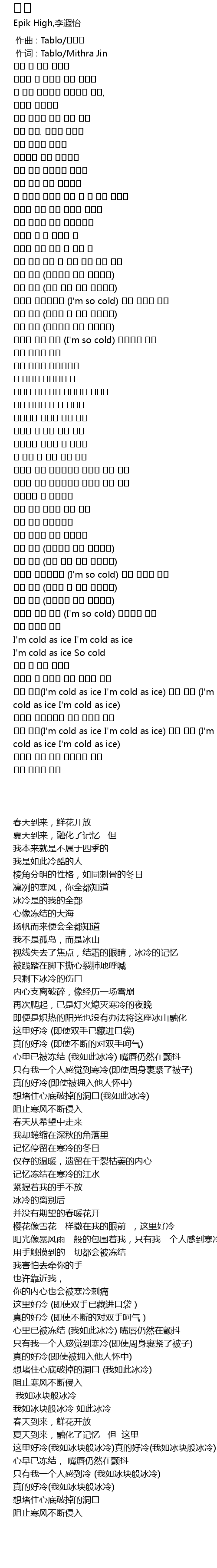 | [03:43.300] | 나만 춥다(I'm cold as ice I'm cold as ice) 너무 춥다 (I'm cold as ice I'm cold as ice) |