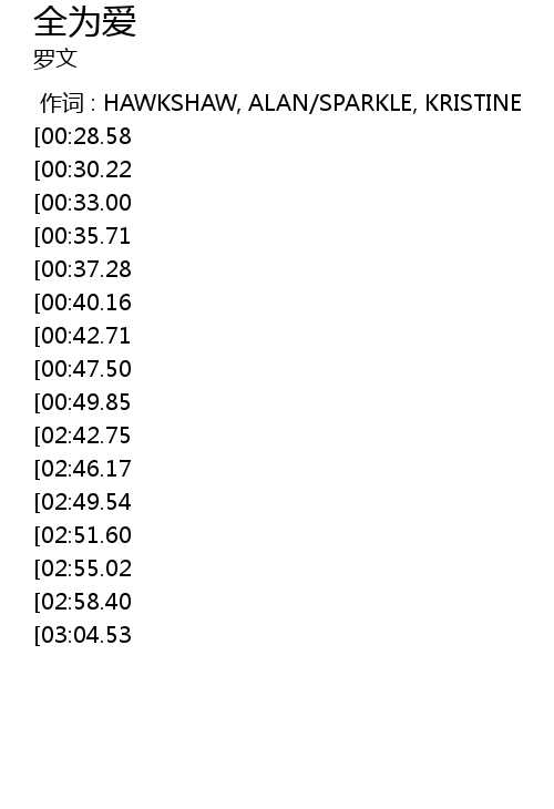 | [03:14.67][02:42.75][01:56.44][00:56.42] | 全为爱 全为爱 |