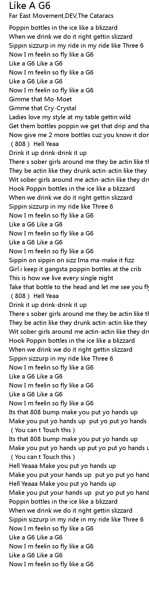 | [00:19.36] | Now I m feelin so fly like a G6 |