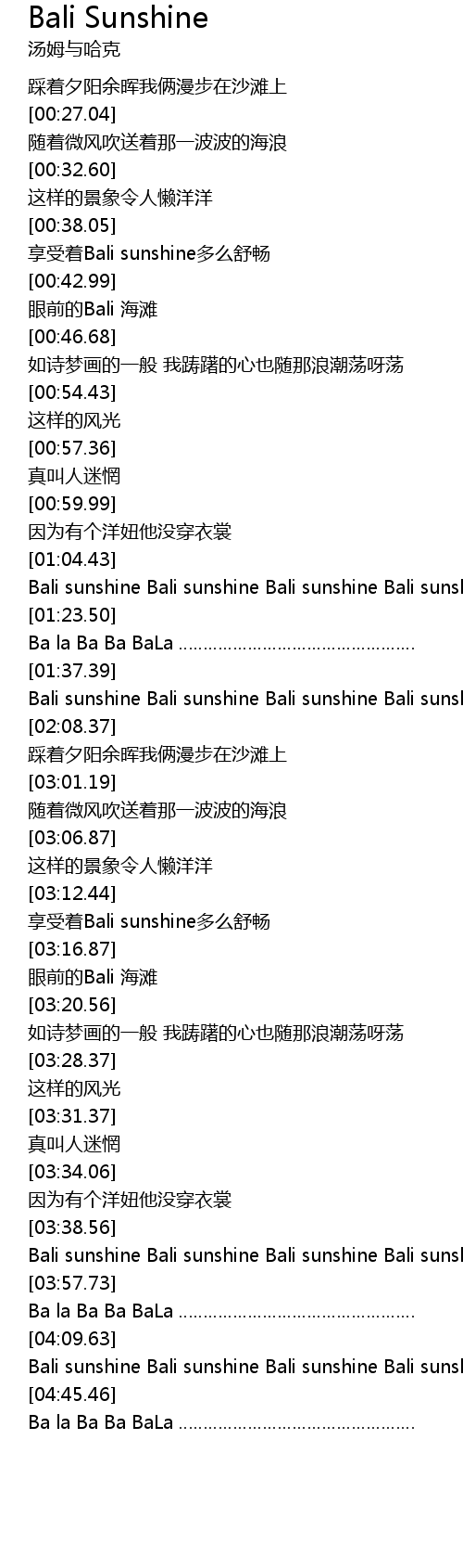 | [01:51.82] | Bali sunshine Bali sunshine Bali sunshine Bali sunshine |