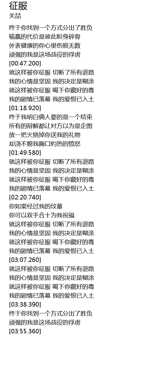 | [03:23.460] | 就这样被你征服 喝下你藏好的毒 |
