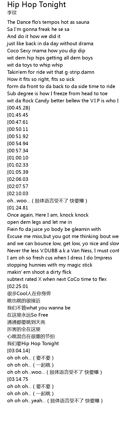 | [02:02.35][01:02.33] | gēn zhe wǒ yì qǐ Hip Hop Tonight Now |
