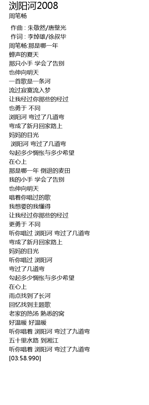 | [03:51.290] | 听你唱着 浏阳河 弯过了九道弯 |