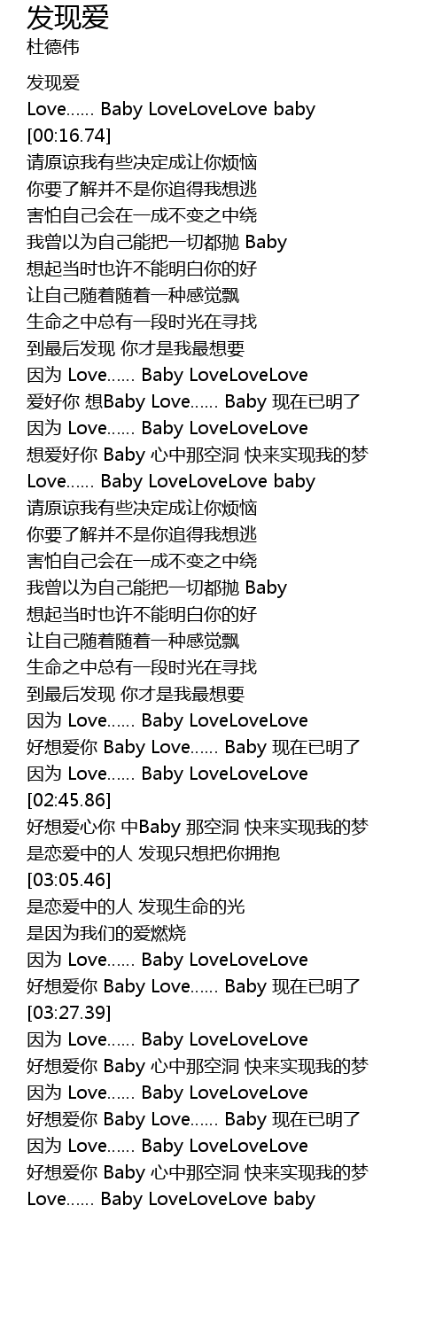| [01:16.25] | ai hao ni xiang Baby Love Baby xian zai yi ming liao |