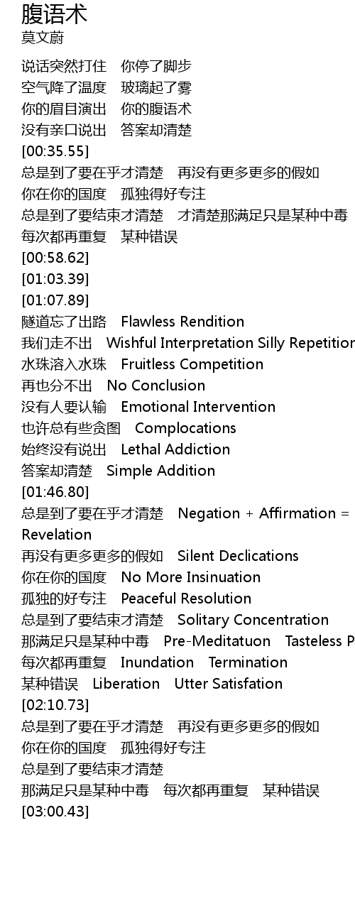 | [01:26.51] | wo men zou bu chu Wishful Interpretation Silly Repetition |