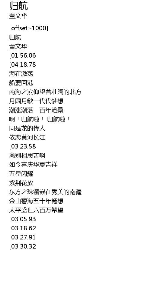 | [04:20.36][04:18.78][04:17.04][04:15.82][04:14.61][04:09.74][04:04.85][02:35.48][02:33.66][02:32.30][02:30.99][02:26.07][02:21.37][00:56.02][00:54.27][00:53.00][00:51.76][00:46.75][00:40.79] | 归航啦! |