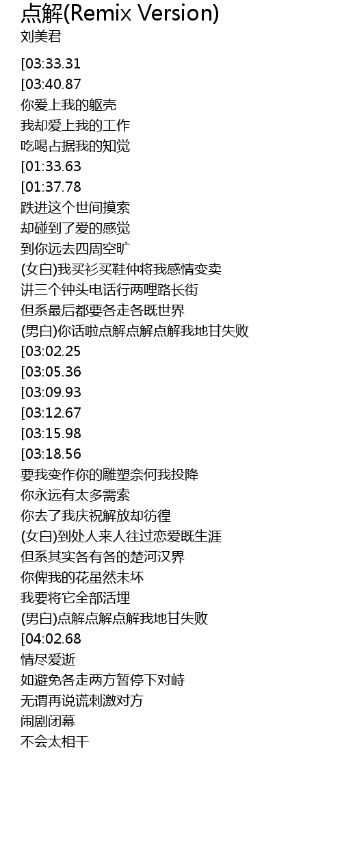 | [00:40.00][03:33.31][04:25.62] | liú měi jūn diǎn jiě remix version |