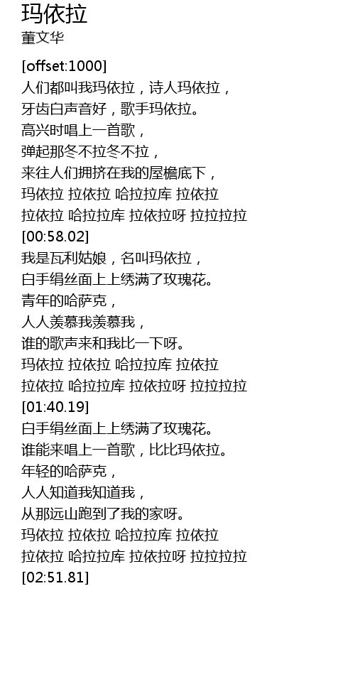 | [00:50.51] | 玛依拉 拉依拉 哈拉拉库 拉依拉 |