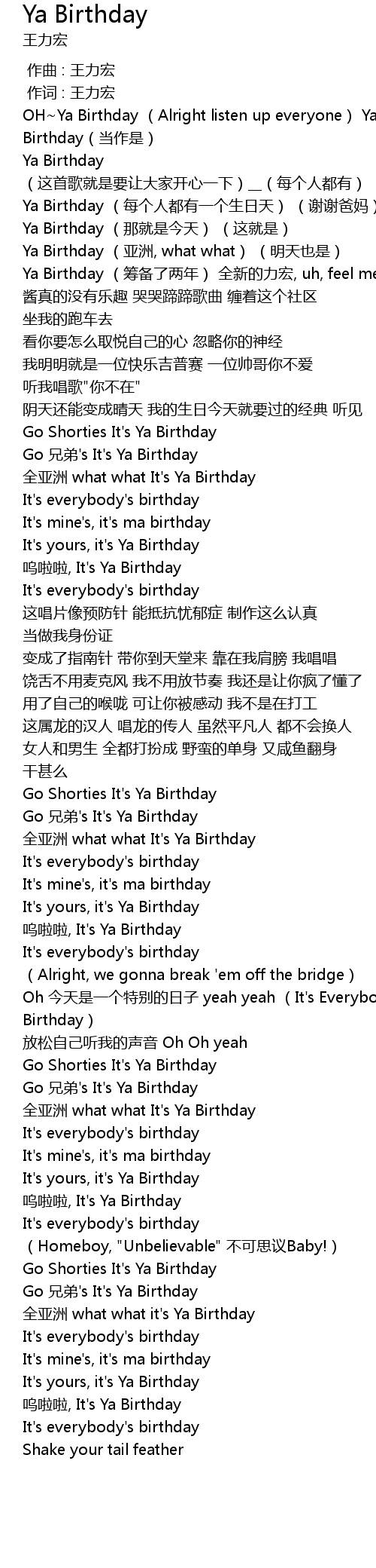 | [00:20.760] | Ya Birthday mei ge ren dou you yi ge sheng ri tian xie xie ba ma |