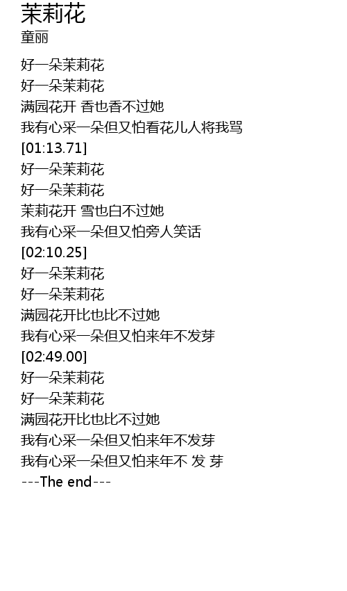 | [01:39.76] | 好一朵茉莉花 |