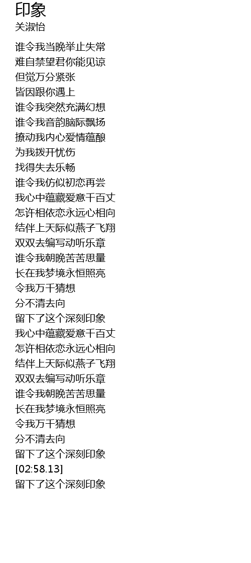 | [03:03.38] | liú xià le zhè gè shēn kè yìn xiàng |