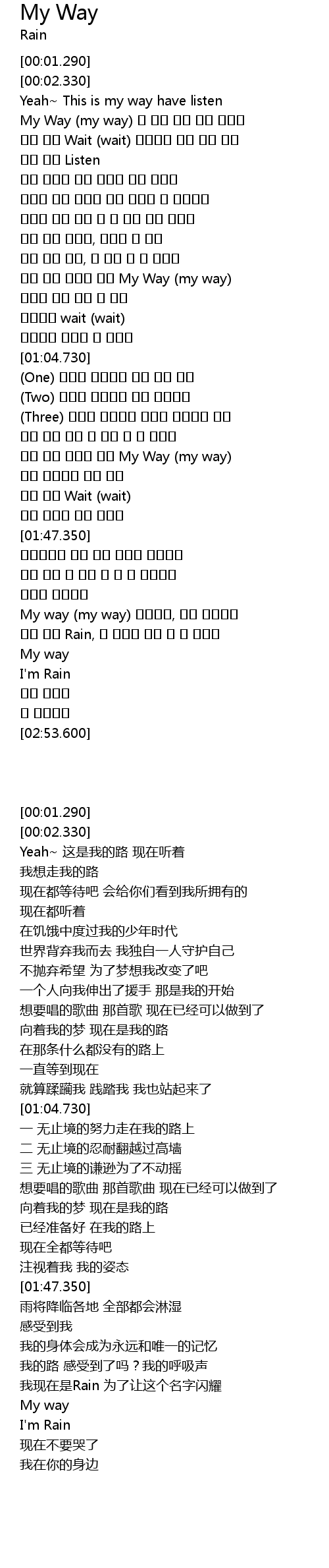 | [00:08.800] | My Way (my way) 난 나의 길을 가고 싶었어 |