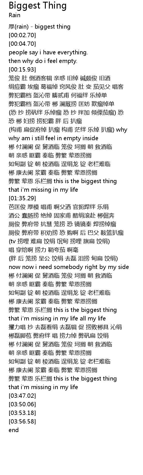 | [03:34.84] | bì fán hūn ēn lè lán gē this is the biggest thing |