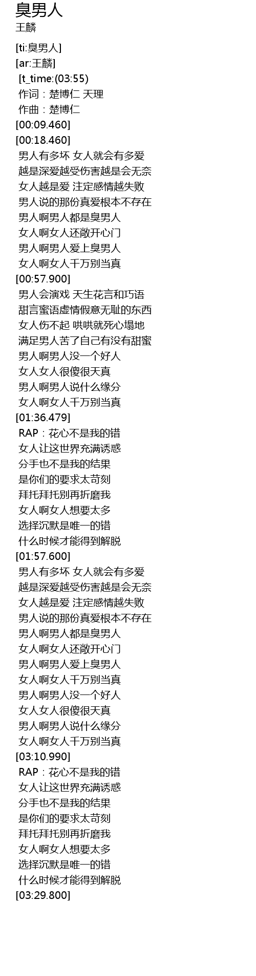 | [00:00.0] [t_time:(03:55)] | 王麟 - 臭男人 |