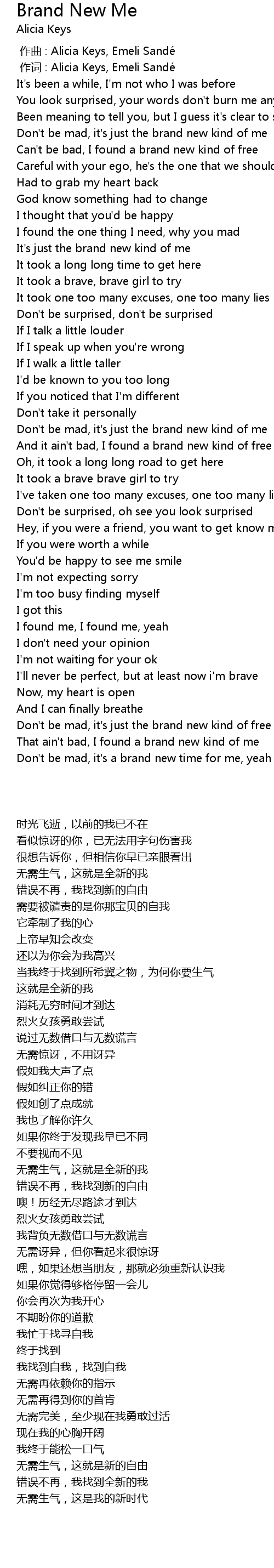 | [00:01.00] | zuò cí : Alicia Keys, Emeli Sandé |