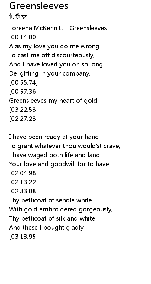 | [03:28.47][03:22.53][02:21.09][01:11.37] | Greensleeves was my heart of joy |
