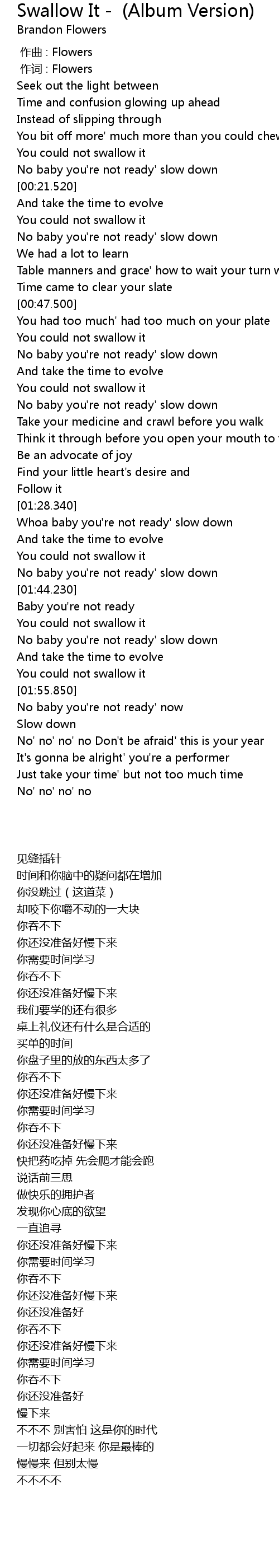 | [01:29.070] | Whoa baby you' re not ready' slow down |