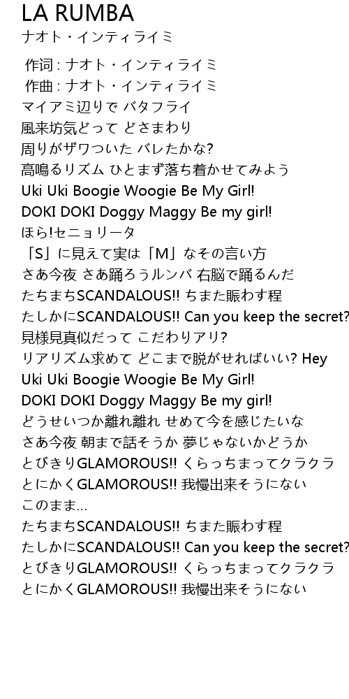 | [00:57.01] | Uki Uki Boogie Woogie Be My Girl! |