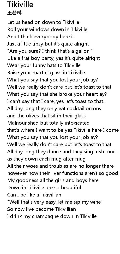 | [01:45.309] | that's where I want to be yes Tikiville here I come Tikiville here I come |