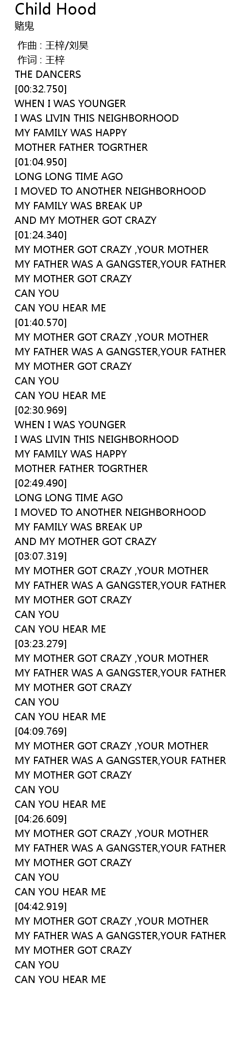 | [04:43.919] | MY MOTHER GOT CRAZY , YOUR MOTHER |