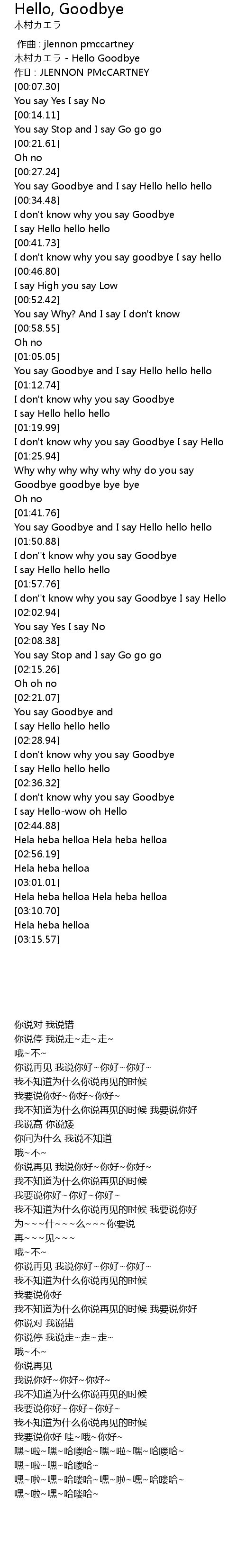 | [01:43.76] | You say Goodbye and I say Hello hello hello |