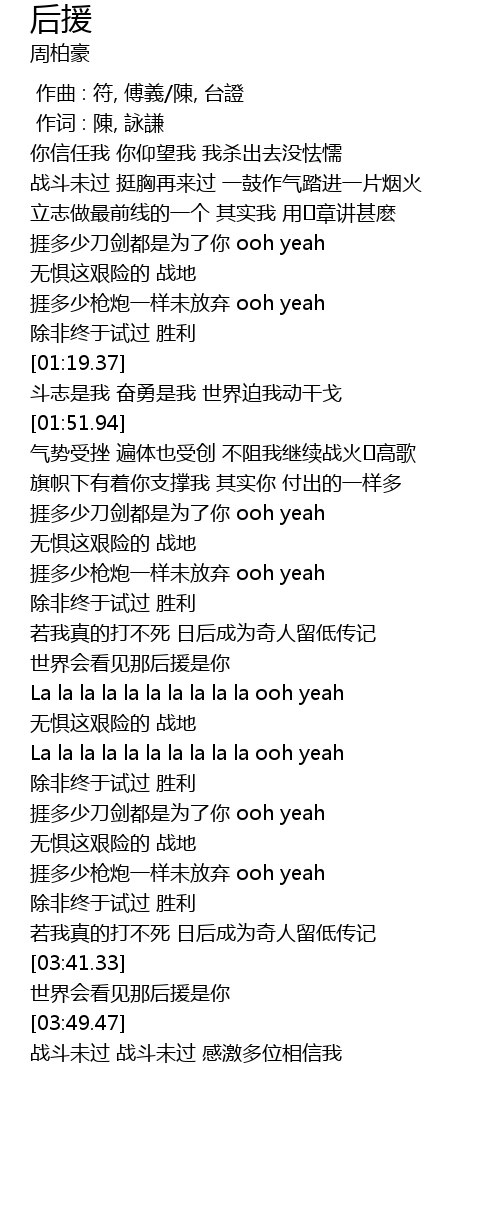 | [01:53.64] | 气势受挫 遍体也受创 不阻我继续战火�高歌 |