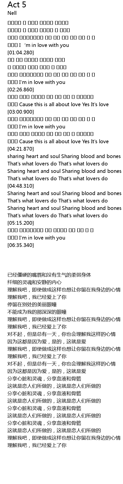| [05:03.580] | Sharing heart and soul Sharing blood and bones |