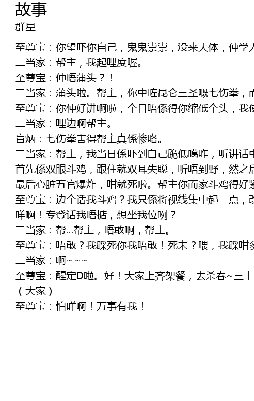 | [00:25.64] | 二当家:帮主,我当日係吓到自己跪低噶咋,听讲话中咗七伤拳呢, |