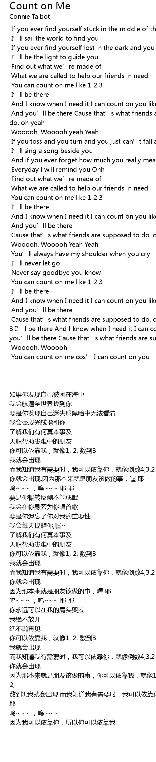 | [02:54.670] | Cause that’s what friends are supposed to do, count on me like 1 2 3 I’ll be there And I know when I need it I can count on you like 4 3 2 And you’ll be there Cause that’s what friends are supposed to do, oh yeah |