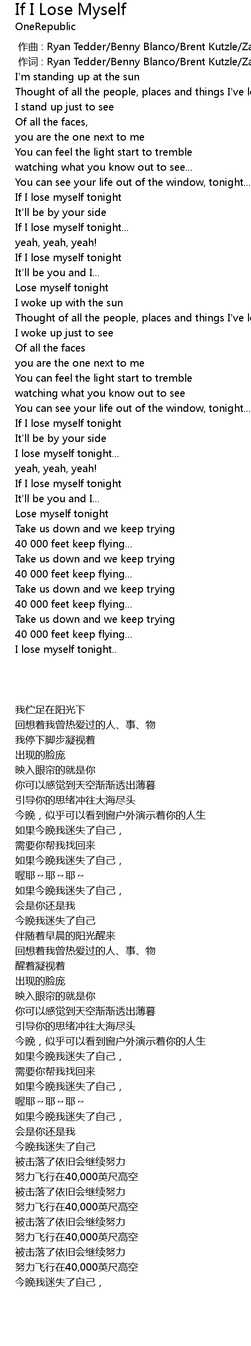 | [00:01.00] | 作词 : Ryan Tedder/Benny Blanco/Brent Kutzle/Zach Filkins |