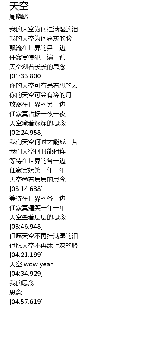 | [01:36.699] | 你的天空可有悬着想的云 |