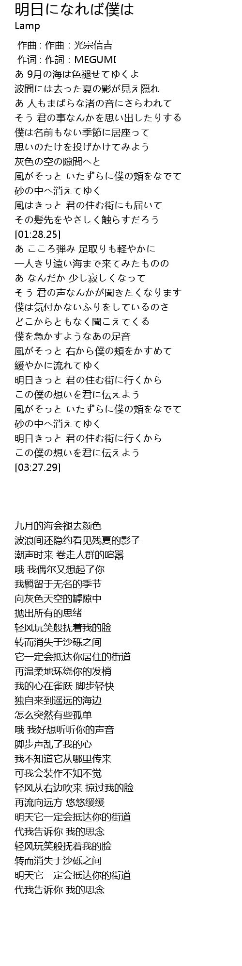| [03:12.26] | 明日きっと 君の住む街に行くから |