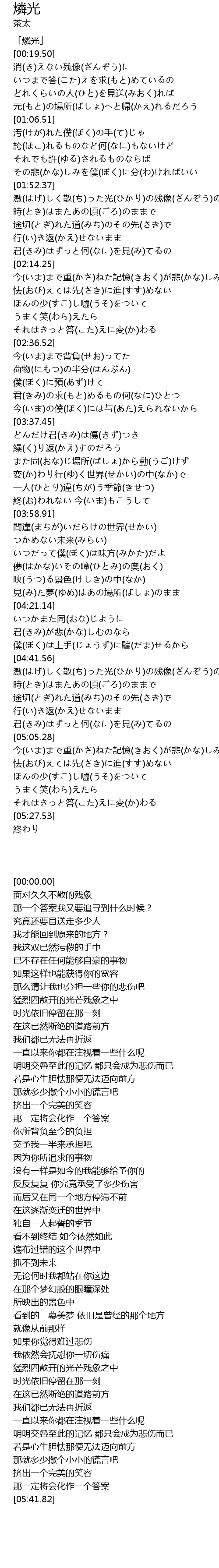 | [04:44.26] | 激(はげ)しく散(ち)った光(ひかり)の残像(ざんぞう)の中(なか)で |