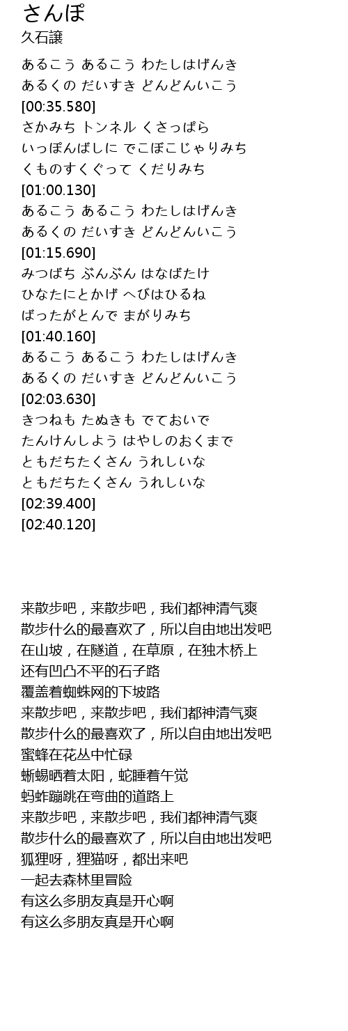| [01:08.760] | あるくの だいすき どんどんいこう |