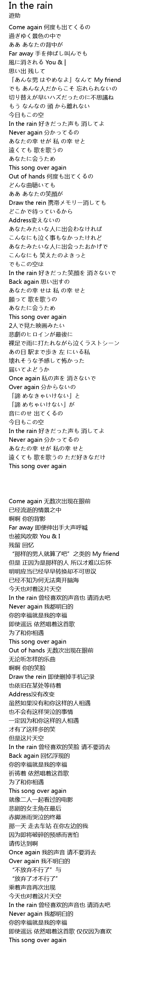 | [02:32.60] | In the rain 好きだった笑顔を 消さないで |
