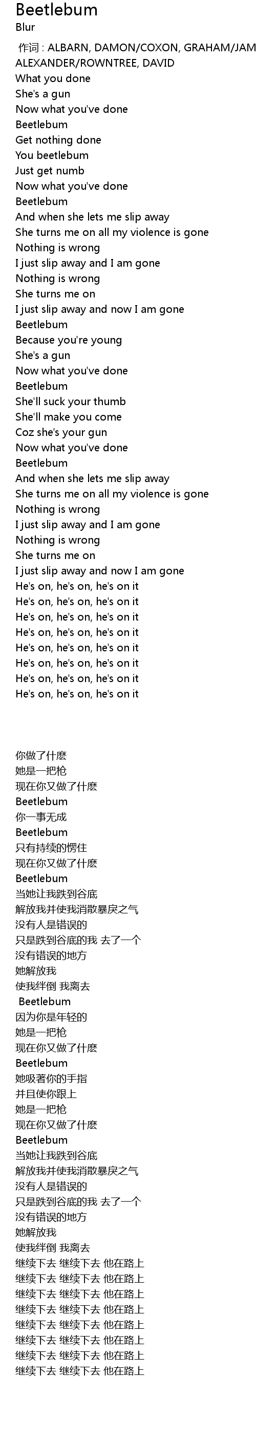 | [00:00.00] | 作词 : ALBARN, DAMON/COXON, GRAHAM/JAMES, STEVEN ALEXANDER/ROWNTREE, DAVID |